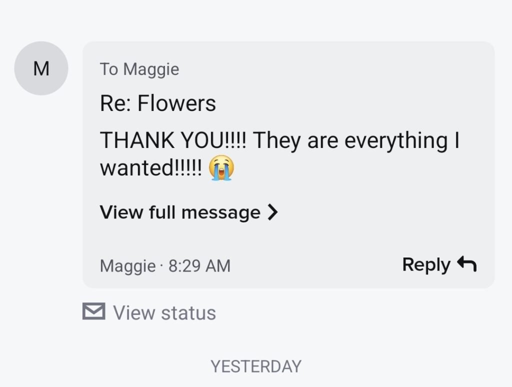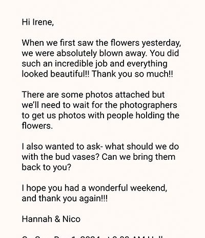 We were so happy with our wedding flowers! Pickup on the wedding day was seamless. Thanks so much Irene, you made our wedding day more beautiful and stress free!