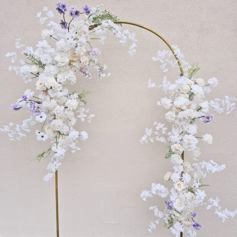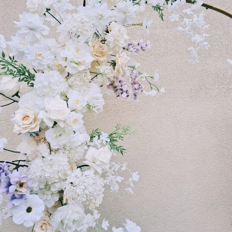 Pretty, soft, and feminine blooms adorn this elegant golden arch. Featuring white and cream silk roses, sweet peas, hydrangeas and a light touch of greenery. This arch is 7′ 2″