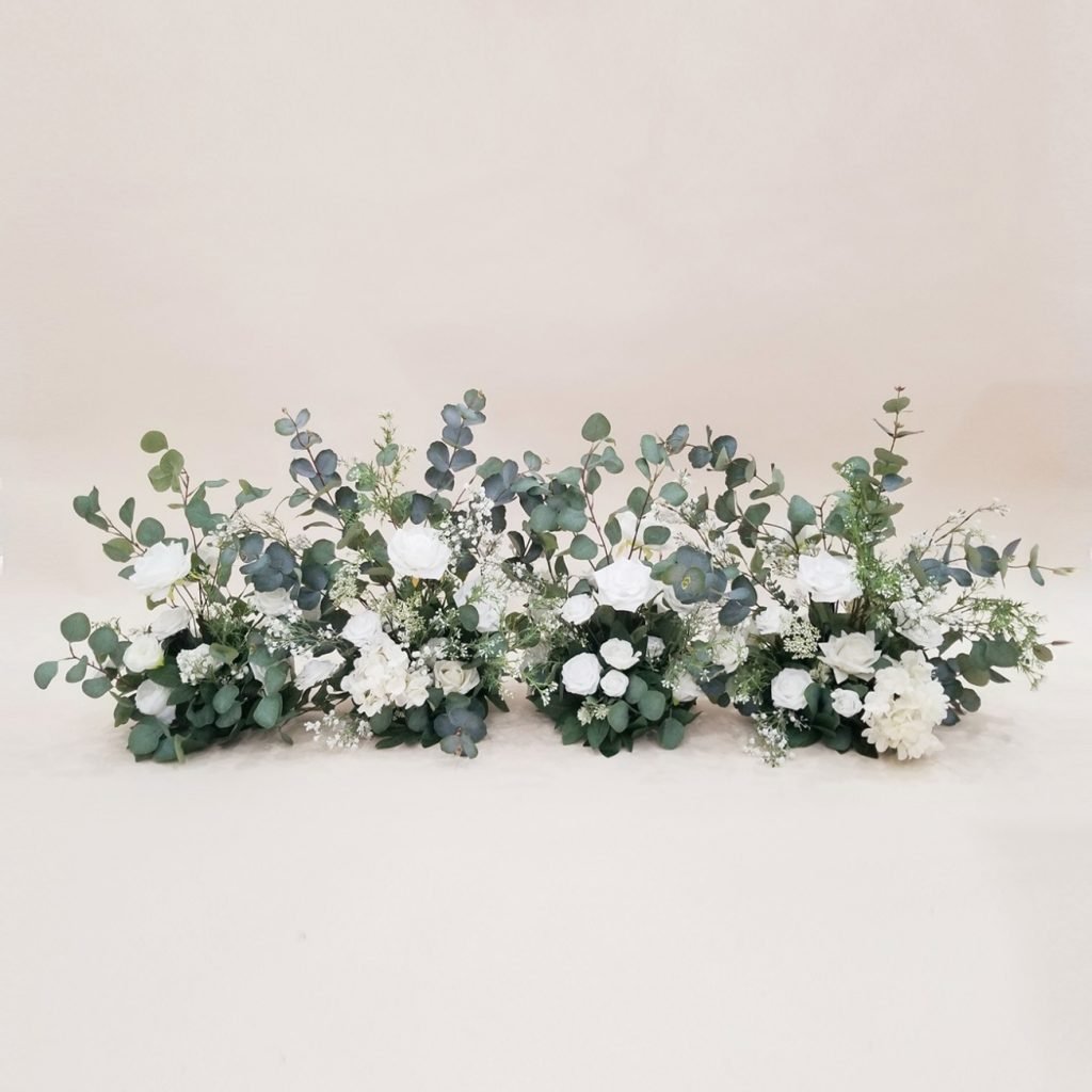 The perfect set to transform your altar without hiding the background. These light and airy silk floral arrangements frame the space beautifully. Artist-designed with luxury faux florals, including, roses, hydrangeas, eucalyptus and Italian ruscus.