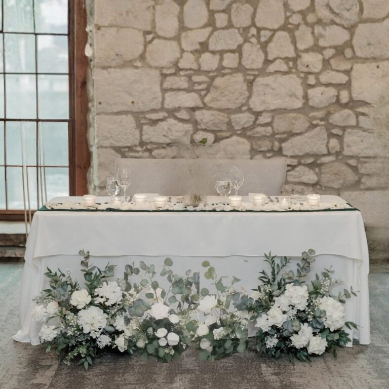 This set includes four 18″ tall arrangements with 2-4 gold pedestals. These are light and easy to move from ceremony to reception. Perfect for placing in front of your Sweetheart table.