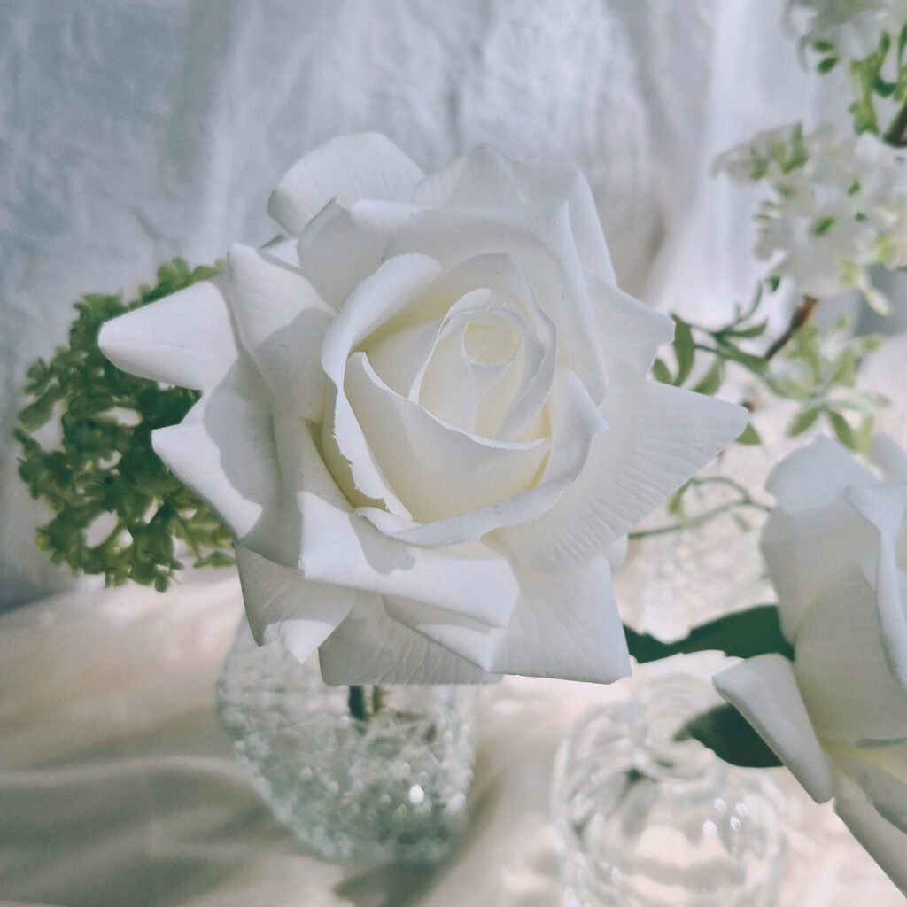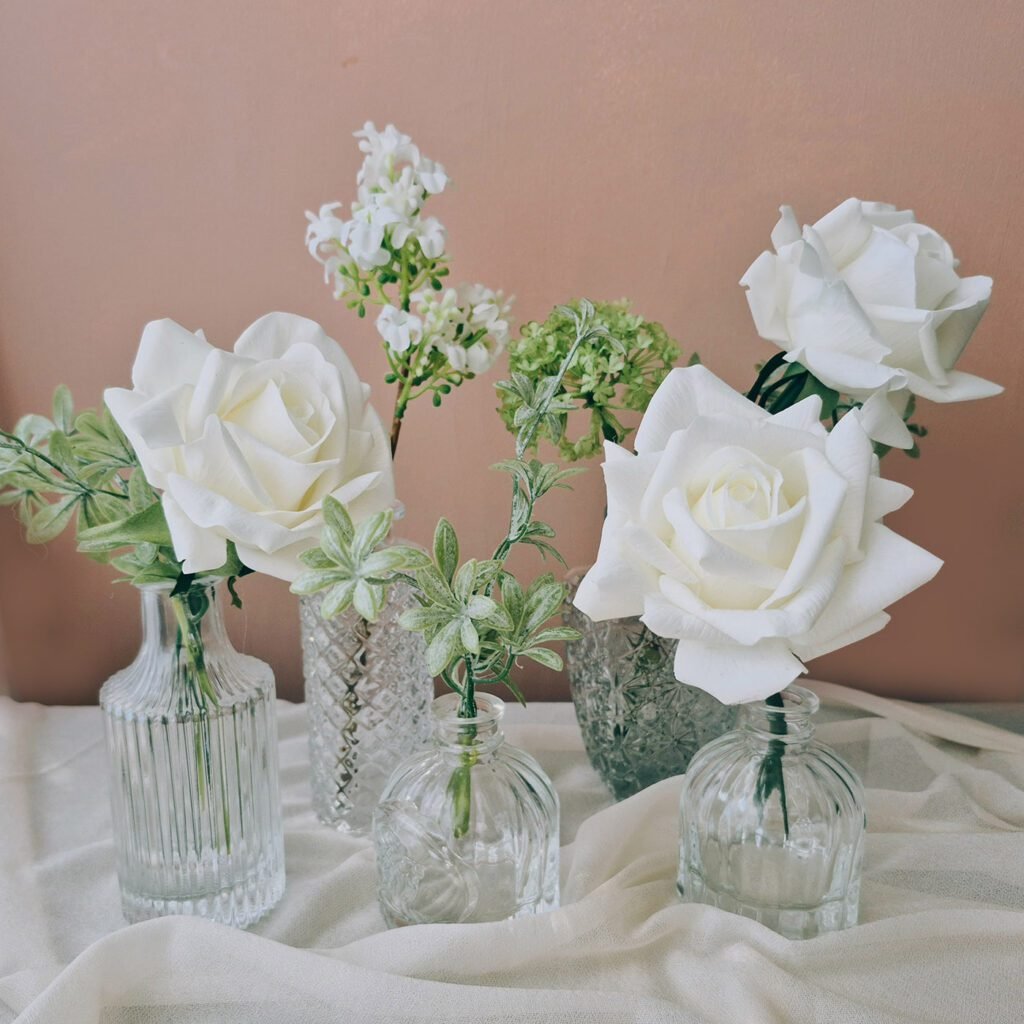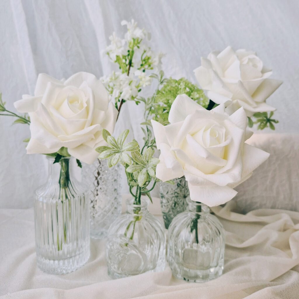 No one is going to believe these roses aren’t real! White, soft and velvety these look incredible. The set includes added greenery and other premium white and green flowers. Perfect for filling in guest tables, use groups of 3-5 for round tables and 6-8 for rectangular tables.