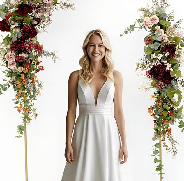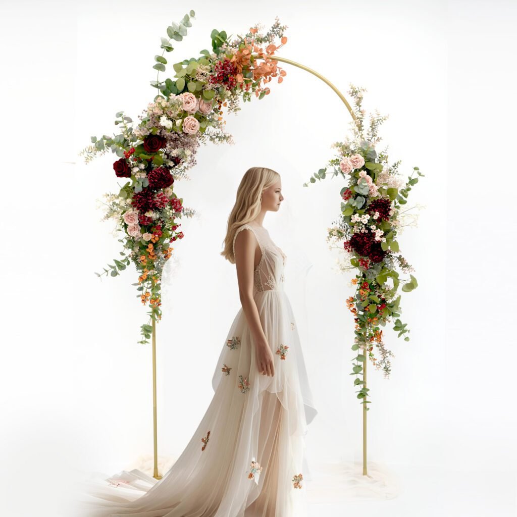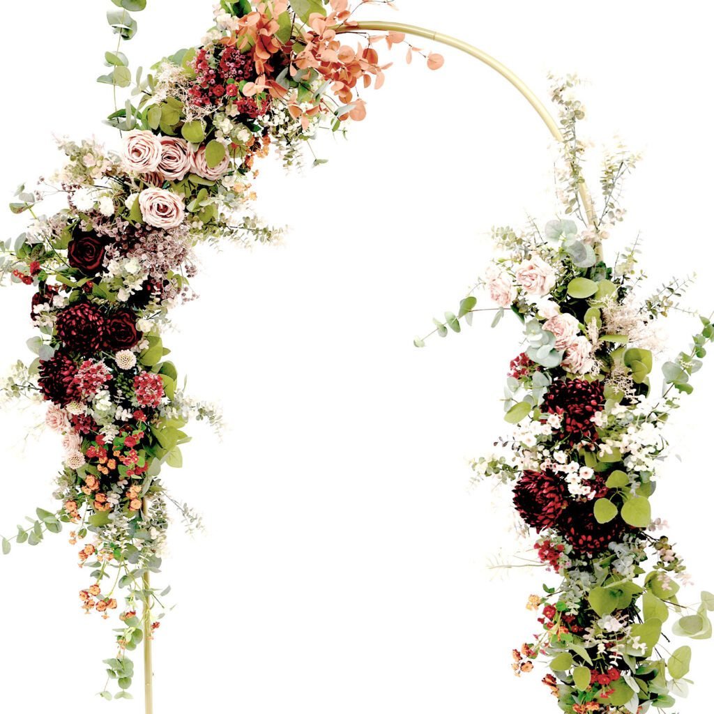 Lush florals on an elegant, gold, u-shaped arch frame, perfect for some fall drama! This design includes silk eucalyptus, burgundy chrysasthanthemums, beige roses and orange apple blossoms with light textural accents. This arch is 7′ 2″ tall