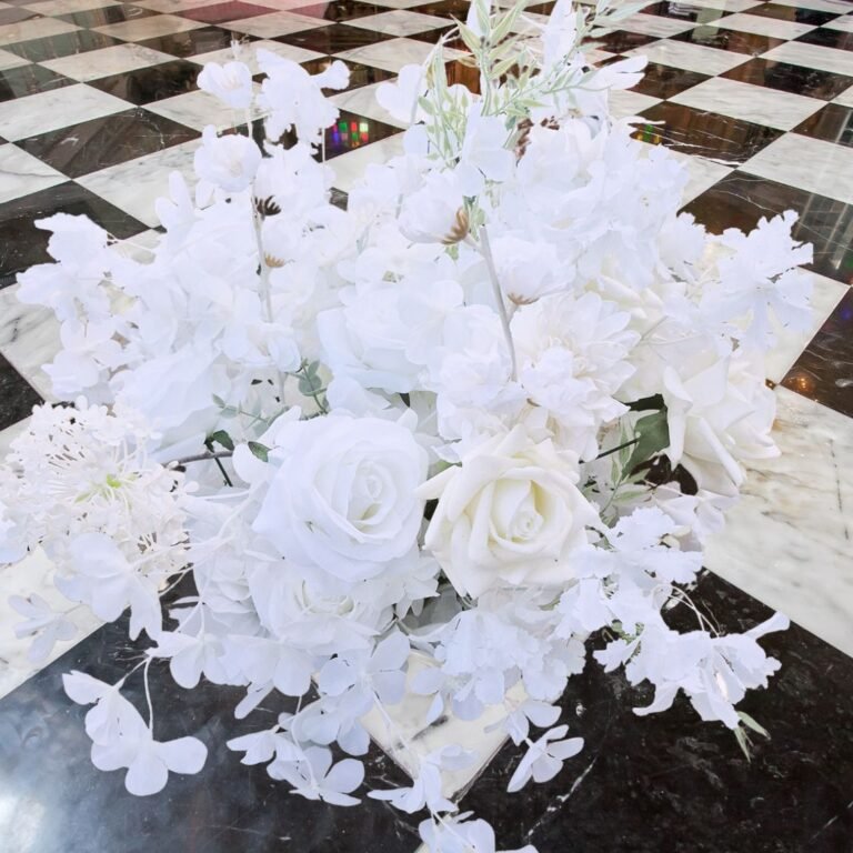 This set includes six 18″ tall arrangements. These are light and easy to move from ceremony to reception. Perfect for placing in front of your Sweetheart table.